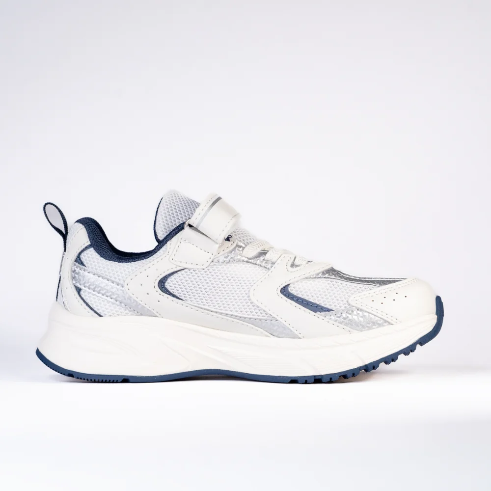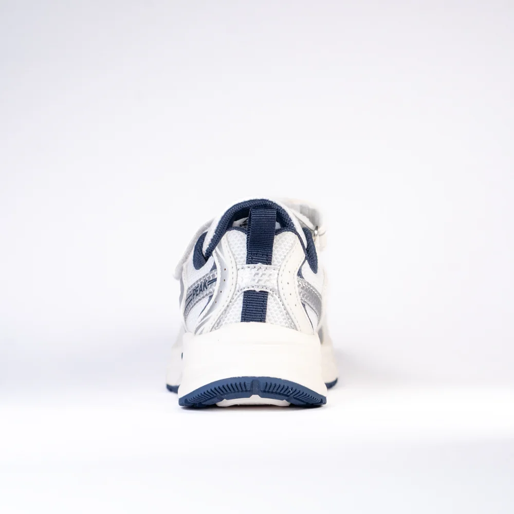 Chaussure de sport **PEAK** au style moderne, en blanc avec des détails bleu marine et argentés. La tige en maille respirante offre légèreté et confort, avec des renforts pour un bon maintien. Fermeture pratique par bande auto-agrippante et lacets pour un ajustement sécurisé. Semelle épaisse avec bon amorti et semelle extérieure antidérapante, idéale pour la marche et l’usage quotidien.